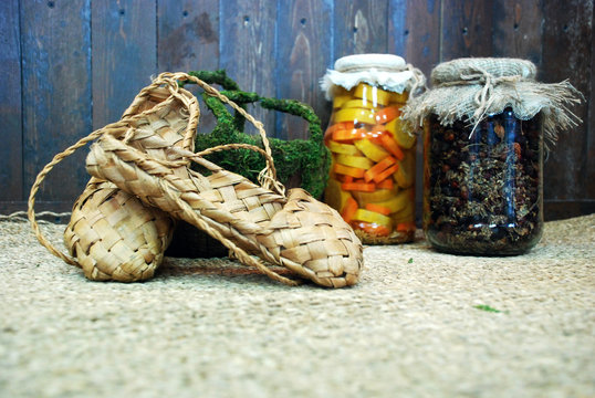 Bast shoes, woven from bast, close-up on the background of grass in summer