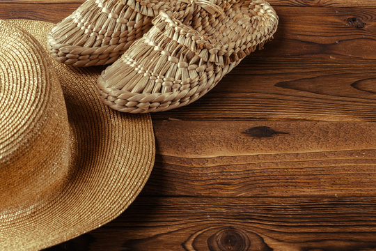 Russian traditional ancient bast shoes made of bast isolated on white background