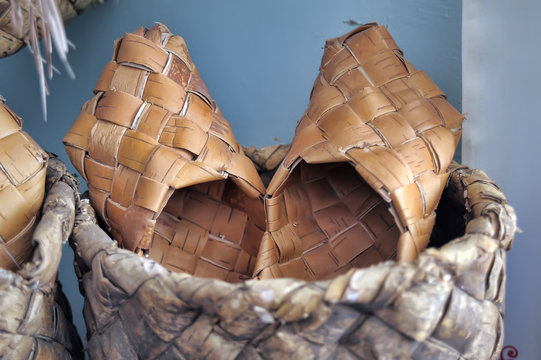 Man feet in national Russian leather shoes postol with rope, isolated on a white background