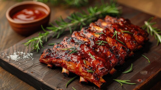 BBQ ribs with a glossy sauce close up to show the succulent meat texture