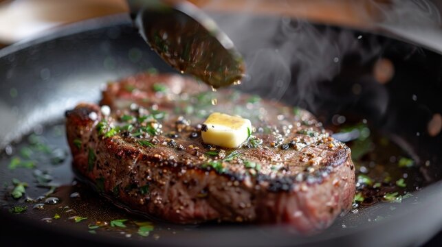 A close-up of a professional chef's hands basting a thick, perfectly seared steak with foaming butter and herbs in a hot pan.