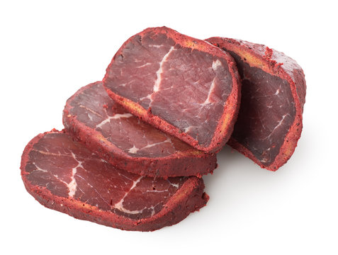 A close up of several slices of basturma on a white surface showing the meat texture and edges