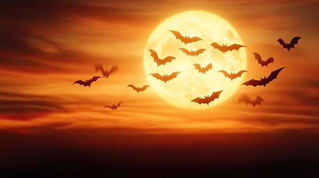 A haunting sunset with a full moon and flying bats, capturing the essence of Halloween and eerie nightscapes.