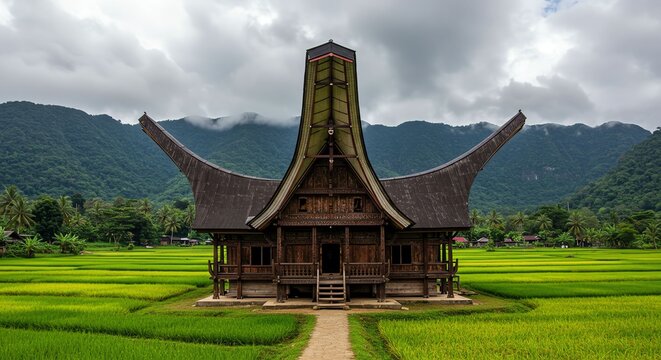 Traditional Indonesian Batak House Surrounded by Green Rice Fields and Mountain Landscape