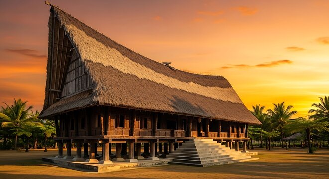 Majestic traditional Indonesian Batak house, a cultural landmark known as Rumah Bolon, at sunset