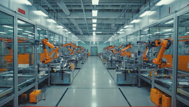 Robotic arms are actively working on an assembly line in a state-of-the-art manufacturing facility. The spacious area is filled with advanced technology and organized workstations