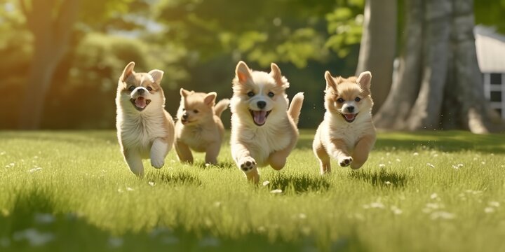 Group of adorable dogs playing and running about on a park's lush grass. Generative Ai.