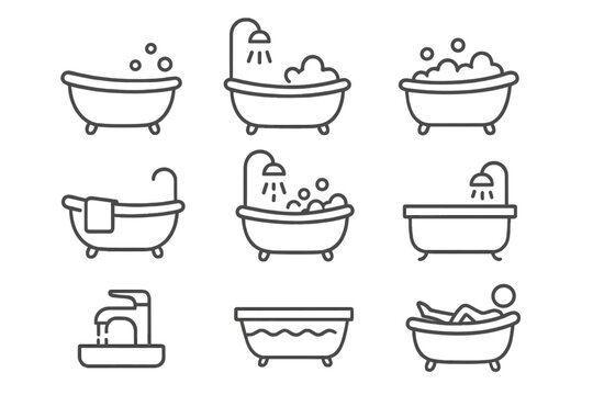 Foam and bubbles icon set. Modern outline style icons for cleaning and washing. Vector illustration of soap, spray, bathtub, shower, and personal hygiene products.