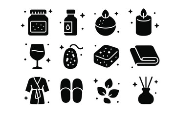 Luxury Bath Essentials. Luxury Bath. Solid icons set of Luxury Bath: bath salts jar, essential oil bottle, bath bomb, candle, wine glass, loofah, sponge, plush