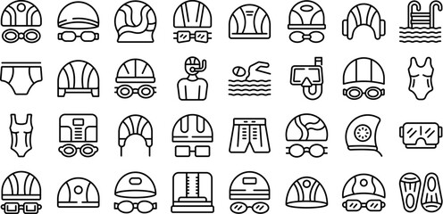Swimming hat and glasses icon set. Swimming hat and glasses vector symbol in black filled and outlined style.