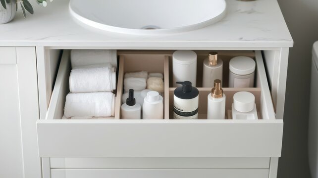 A serene bathroom scene featuring neatly folded towels and organized storage baskets, accentuated by natural light and greenery.
