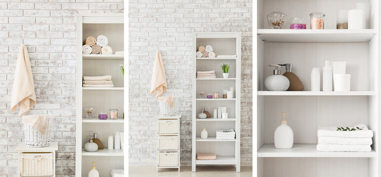 Collage of shelving units with towels and cosmetics near brick wall in bathroom
