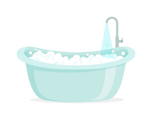 Large porcelain white bathtub filled with water and foam by wooden shelves