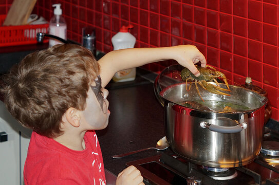 A little boy 4-5 years old puts live crayfish in a pot of boiling salt water and cooks crayfish in the kitchen for dinner