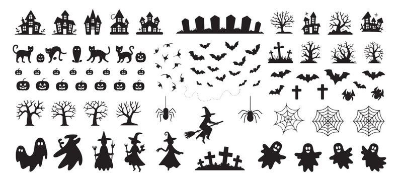 Halloween silhouettes in black vector style with ghosts and bats isolated on white