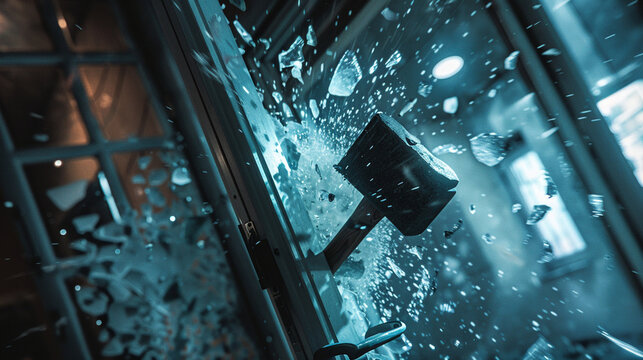 Image from the peephole of the apartment. A soldier of a special forces group knocks out the front door with an assault ram. SWAT concept. Anti-terrorism, fight against crime.