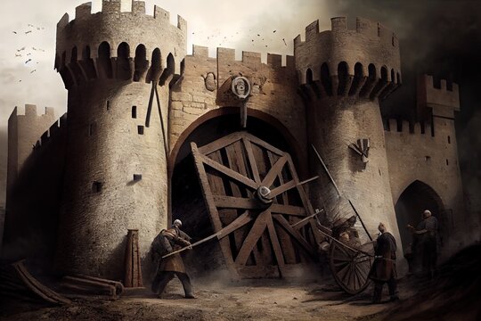 storming a medieval fortress with battering ram, preparing to break down the gate, created with generative ai