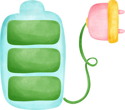 Eco friendly save energy, cute full green battery plug and green leaf symbol watercolor painting