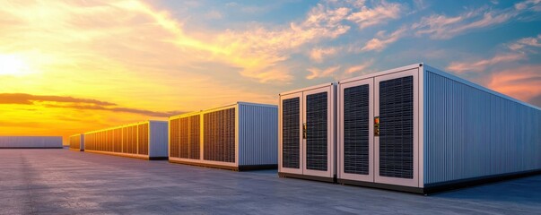 Concept of energy storage system. Renewable energy - photovoltaics, wind turbines and Li-ion battery container in morning fresh nature. 3d rendering.