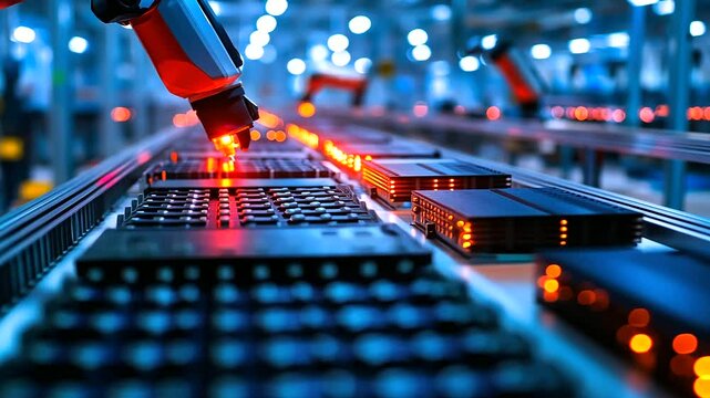 Close-up of Lithium-ion Cells for High-voltage Electric Vehicle Batteries Manufacturing Process. Battery Cells for Automotive Industry on Production Line. High Capacity Battery on Conveyor.