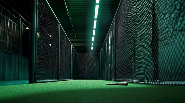Moody Indoor Batting Cage at Night with Dramatic Lighting and Shadows