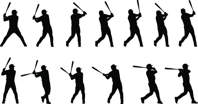 Baseball player action silhouette collection with batting throwing and running poses sports motion black vector set