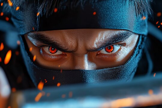 A dramatic scene of a ninja emerging from the shadows, with their katana drawn and eyes focused, ready for an intense, silent battle