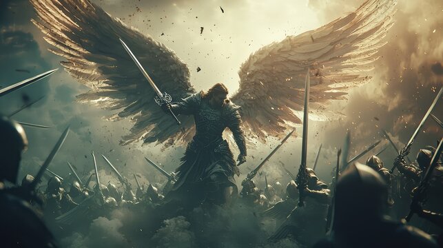 A powerful angel with majestic wings stands ready for battle amidst a fierce scene of warriors and swords, embodying strength and courage.
