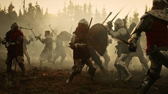 Epic Battlefield: Armies of Medieval Knights Fighting with Swords. Dark Ages Warfare. Action Battle of Armored Warrior Soldiers, Killing Enemies. Cinematic Historical Reenactment. Wide Slow Motion