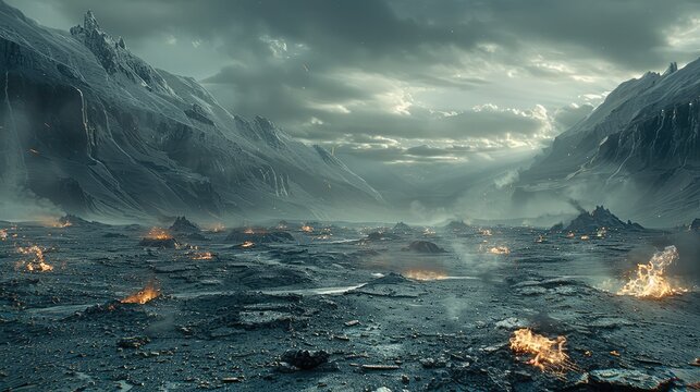 A large empty battlefield surrounded by mountain ranges littered with smoldering fires and battle wreckage. Generative AI.