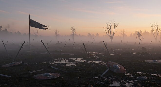 Eerie battlefield strewn with swords, shields, and tattered flags under a misty dawn sky
