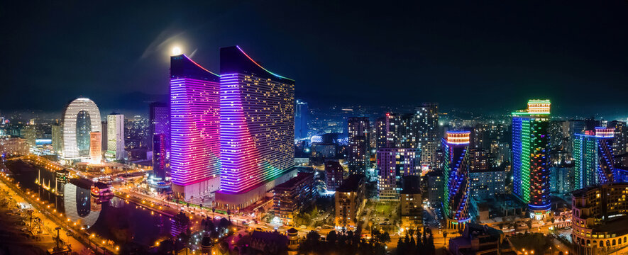 A panoramic bird's eye view of the illuminated Black Sea coastline in Batumi, Georgia