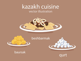 Vector set of national kazakh cuisine, dishes. Beshbarmak, baursak and qurt.