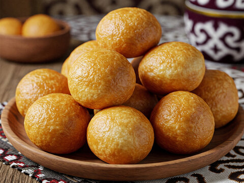 Freshly baked Boortsog (baursak) Traditional Kazakh Asian food in the sunrise at Kazakh home
