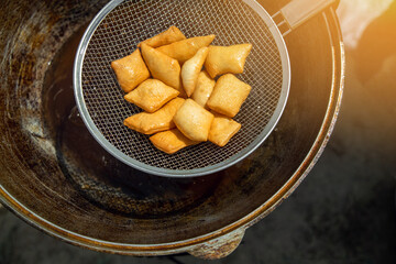 Traditional Kazakh and central asian fresh baursaks are taken out of a large cauldron with a colander.