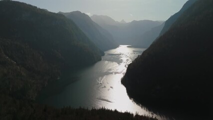 Drone shot over Konigssee in Schonau am Koenigssee, Berchtesgadener Land, Bavaria, Germany. This fjord-like mountain lake lies amidst dramatic peaks and forests in Berchtesgaden National Park.