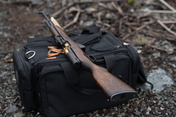 SKS Rifle on shooter's bag – wide depth of field alt angle