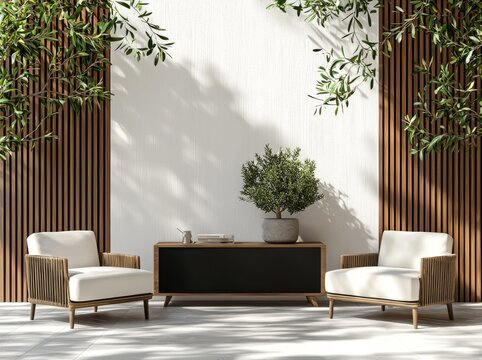 The patio has outdoor furniture, a BBQ kitchen deck, and a deck for picnics. The backyard has armchairs and trees. There is also a large terrace. Our outdoor lounge complex is 3D rendered.