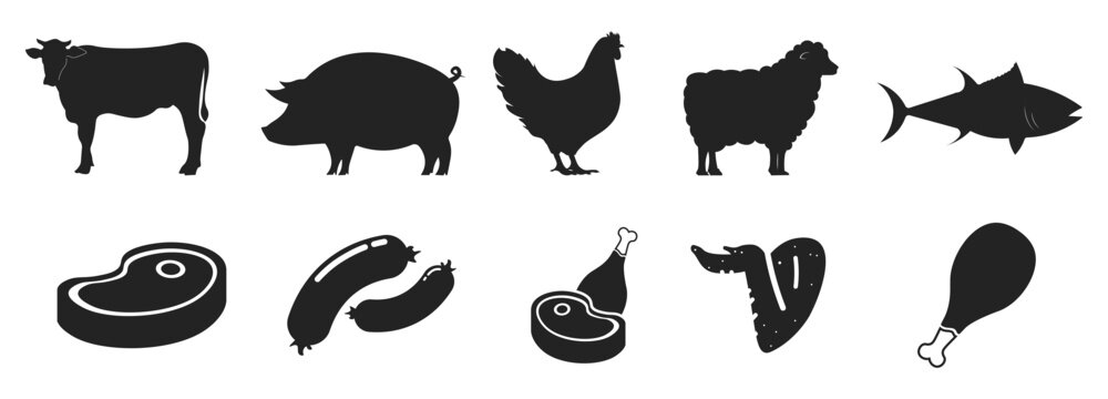 Bundle set pictogram icon of meats and animals, cow, pig, chickem, lamb, fish