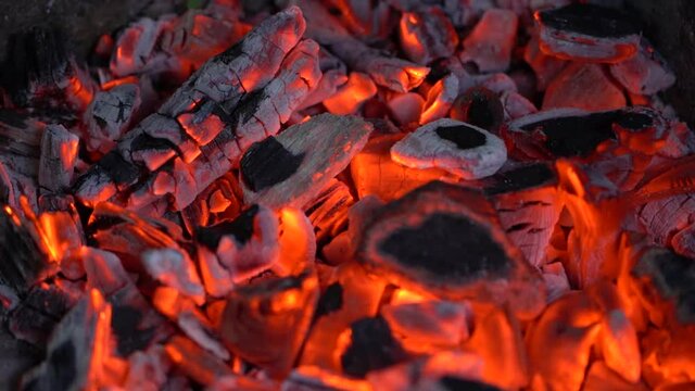cooking, bbq and grilling concept - charcoal smoldering in brazier outdoors