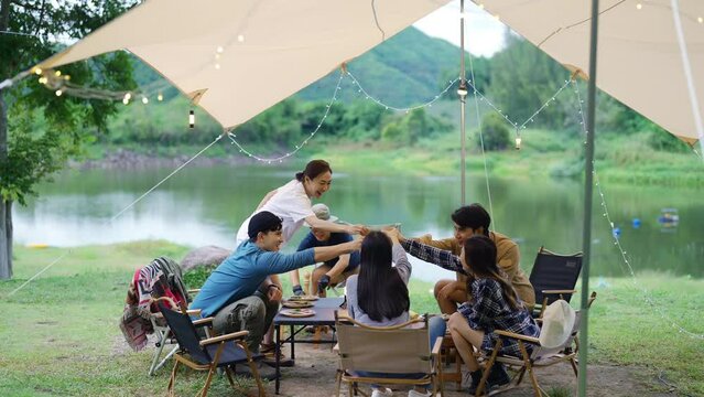 Group of Happy Asian man and woman enjoy and fun outdoor lifestyle travel nature camping in forest on summer vacation. People friends having dinner eating bbq grill and drinking beer together at night