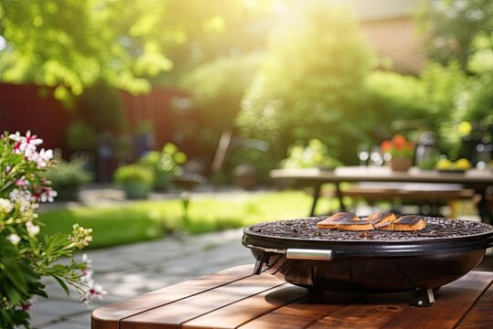 Summer time in backyard garden with grill BBQ, wooden table, blurred background
