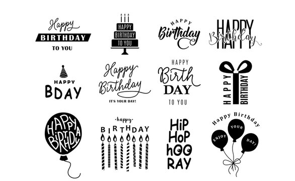Happy Birthday logo set vector background. Monochrome design element for greeting cards, banner, print with lettering typography text sign, quote, cake, candle, gift, balloon isolated on white
