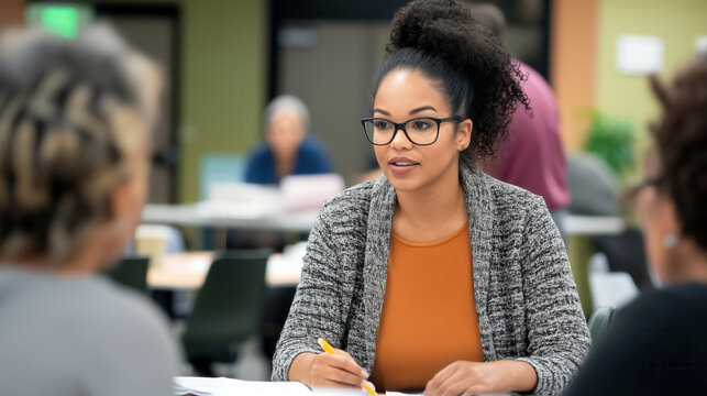 Community Focused. A kind African American woman officer, Community member discussions at town centers for helping people.