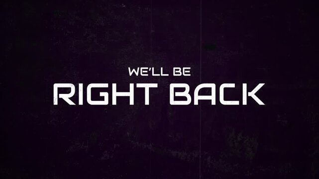 We'll be right back animation in blue colors with glitch on black background. Animated We'll Be Right Back Neon Banner for Live streams, animated stream overlays.