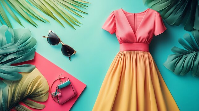 composition with beach accessories on a yellow background with green foliage. Beach travel concept. horizontal background with empty place for text.