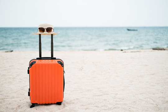 Summer holiday and traveler concept, Straw hat with sunglasses is on the orange suitcase on the beach and sea background with copy space