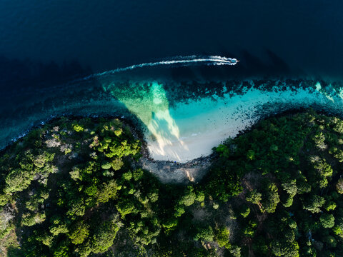 Drone shot of a boat cruising past a hidden beach in Thailand, surrounded by dense green jungle and vibrant blue waters.