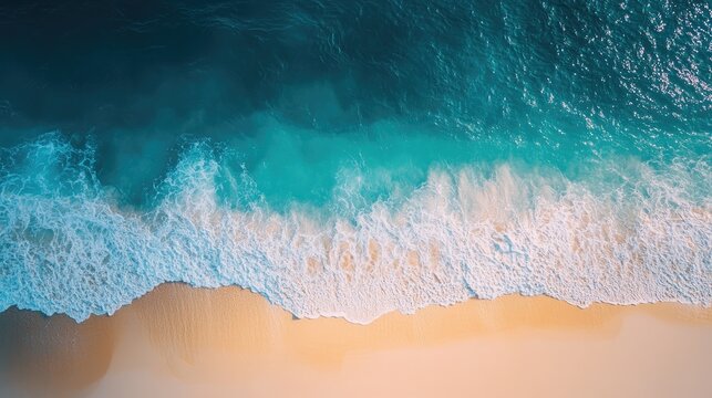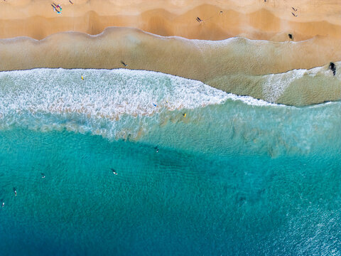 A top-down shot of turquoise waves rolling onto a golden sandy beach with swimmers and sunbathers enjoying the coastal beauty