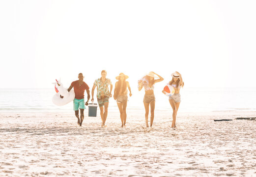 beach ball on a tropical sandy beach during summer. Beach ball in sand. Summertime vacation with clear blue water and the sun